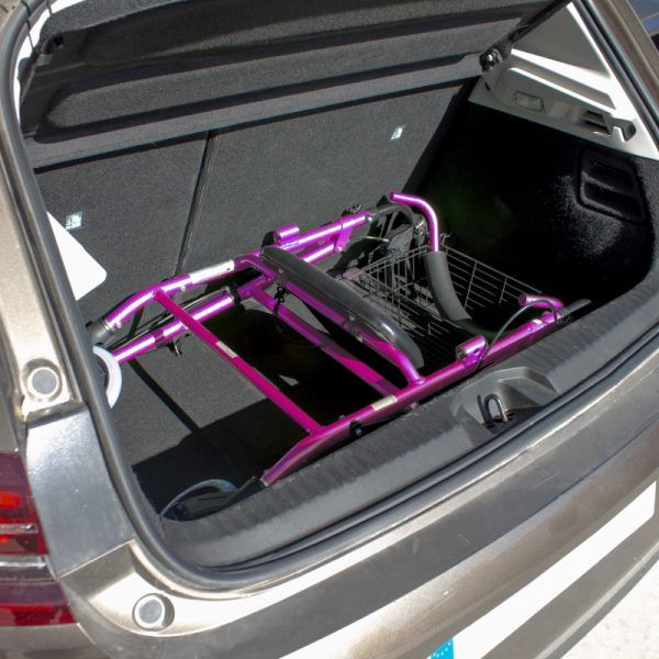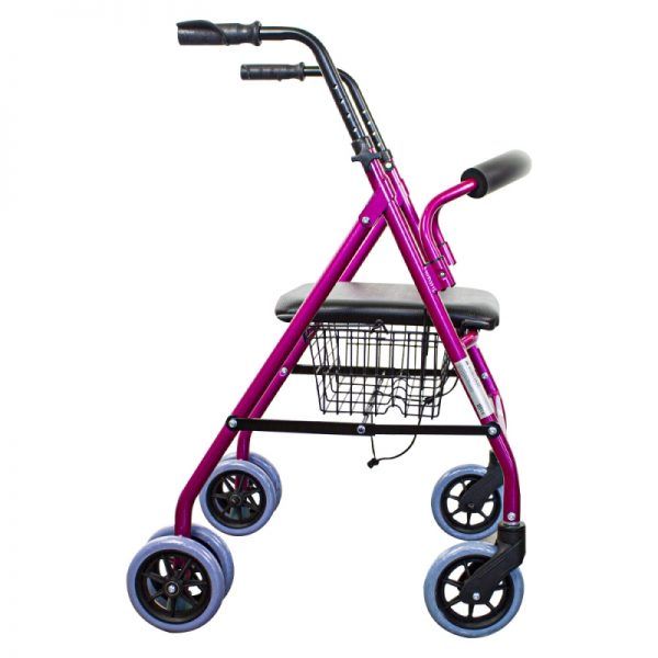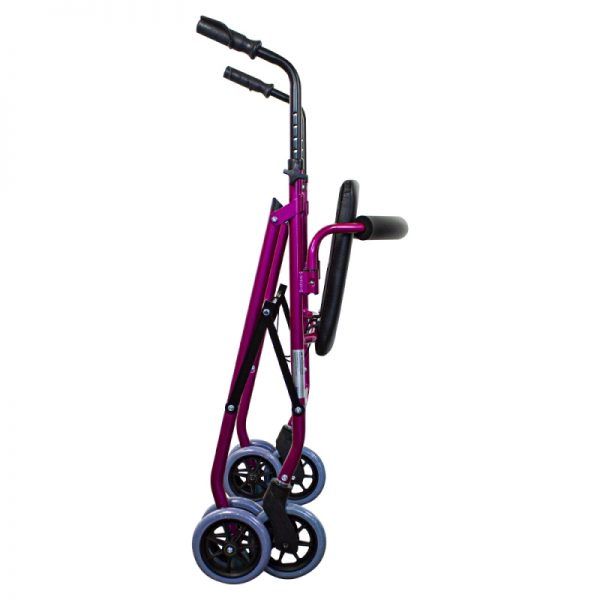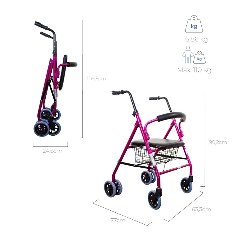 - Cuenta con dos ruedas delanteras giratorias 360º, un asiento confortable que permite el descanso del usuario, un respaldo acolchado y frenos que se activan por presión al ejercer fuerza sobre las empuñaduras (dejando caer el peso del cuerpo sobre los puños).