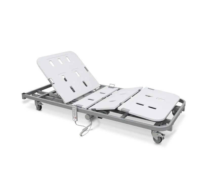 Cama eléctrica con carro elevador Pardo Helia en posición de altura mínima (22 cm).