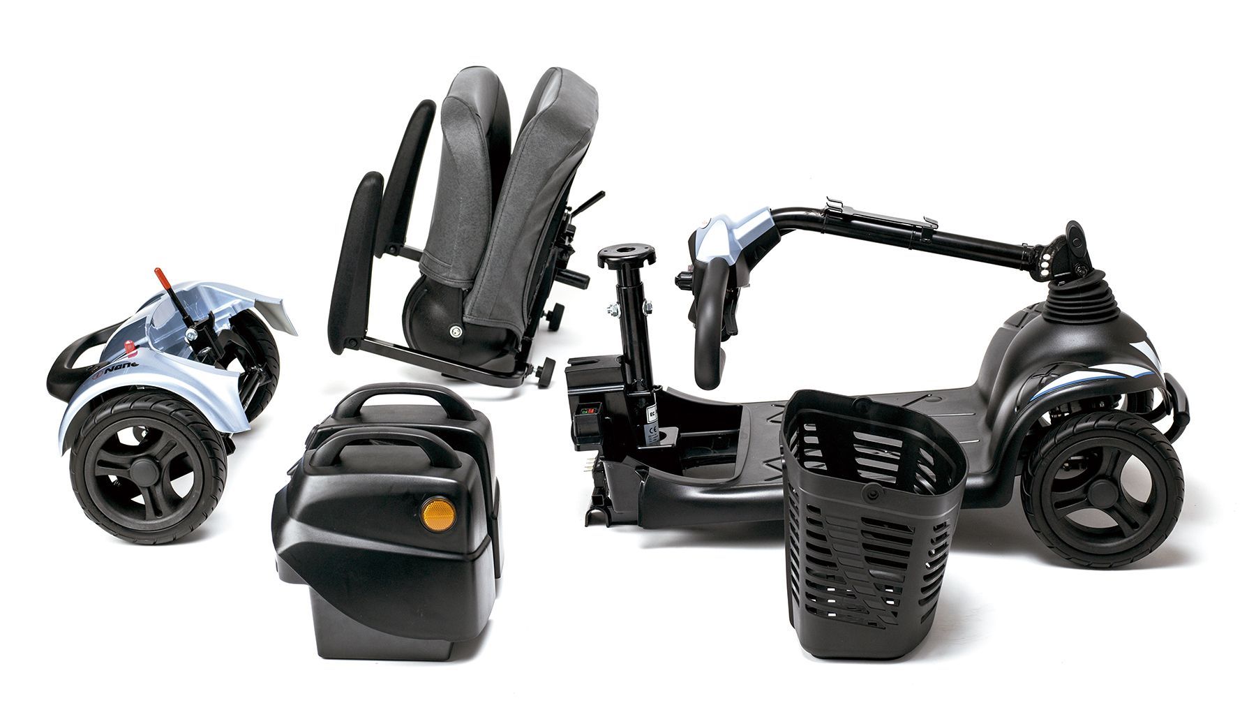 Scooter eléctrico I Nano desmontado en varias piezas para facilitar el transporte.
