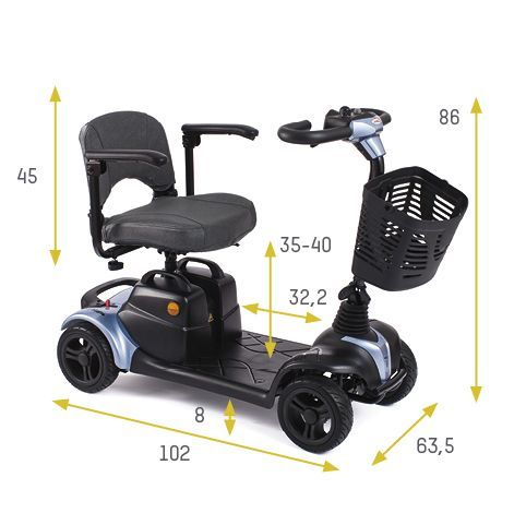 Este modelo destaca por sus dimensiones reducidas, con solo 99 cm de largo y 63,5 cm de ancho, lo que permite moverse cómodamente en interiores, ascensores o pasillos estrechos.